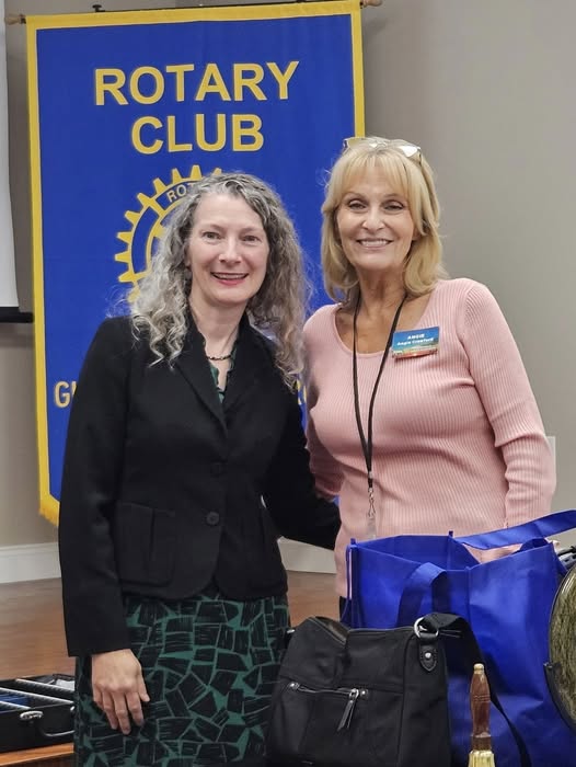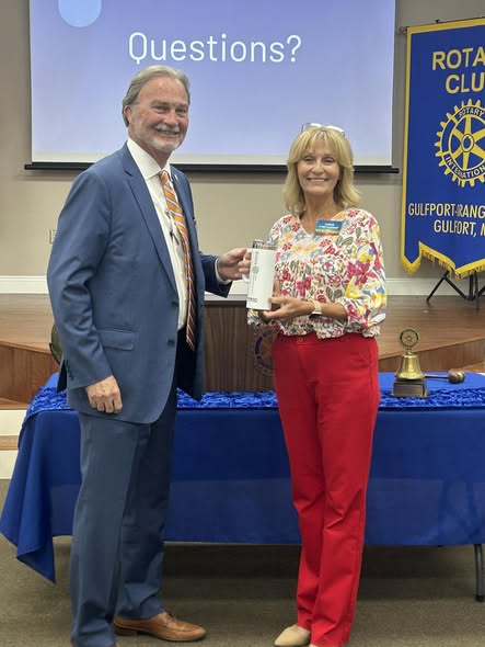 A huge thank you to Dr. Sarah Crisler-Ruskey Director of the Director of the Harrison Counry Library Systems for speaking to us on December 1, 2025. Sarah is also a fellow Rotarian in the Rotary Club of Gulfport, our sponsoring club! Thank you Sarah! Please come back! She is pictured here with Club President Angie Crawford!